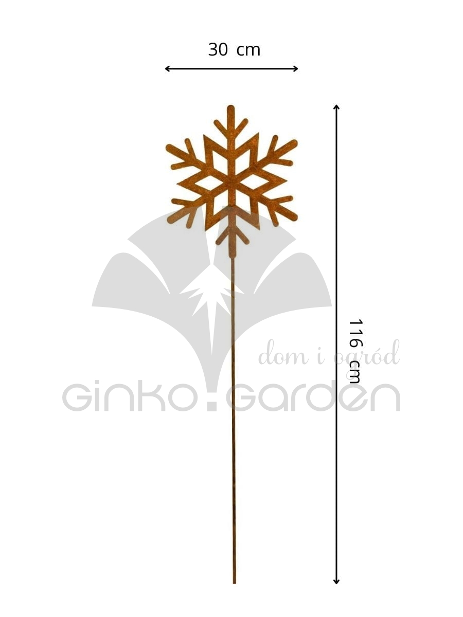 Rdzawa śnieżynka na pręcie to wyjątkowa ozdoba ogrodowa, która wprowadza magiczny, zimowy klimat do każdej przestrzeni zewnętrznej. Jej geometryczny kształt i symetryczne ramiona sprawiają, że przyciąga wzrok, stając się subtelnym, ale wyrazistym elementem dekoracyjnym. Umieszczona na pręcie może być łatwo wbita w ziemię, donicę, skrzynię balkonową lub rabatkę. Dekoracja wykonana została z metalu pokrytym naturalną warstwą rdzy, co nadaje jej industrialnego i rustykalnego charakteru. Rdzawa powierzchnia tworzy niepowtarzalną patynę, dzięki której każda śnieżynka jest jedyna w swoim rodzaju. Materiał jest odporny na warunki atmosferyczne, dzięki czemu ozdoba może być eksponowana na zewnątrz przez cały sezon zimowy. Idealna na Boże Narodzenie i okres zimowy, śnieżynka świetnie komponuje się z innymi metalowymi dekoracjami, takimi jak aniołki, choinki czy gwiazdy. Doskonale sprawdzi się jako ozdoba świątecznego ogrodu, tarasu, wejścia do domu, ale także jako oryginalny dodatek do kompozycji świetlnych czy naturalnych stroików.