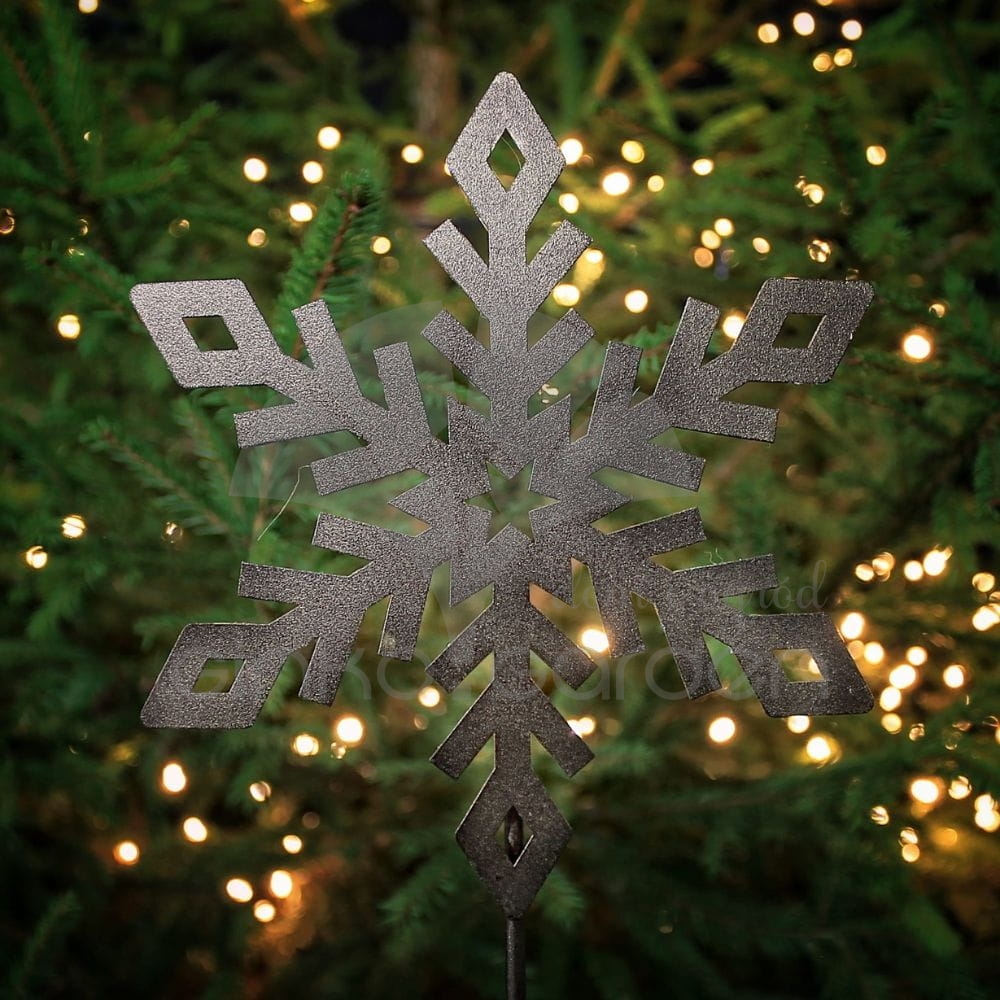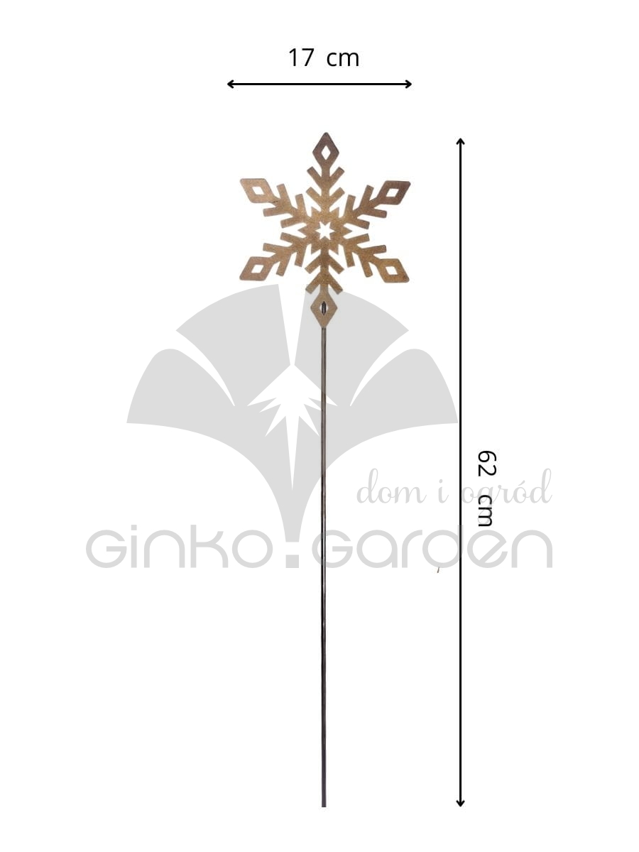 Metalowa dekoracja na Boże Narodzenie - śnieżynka na pręcie do ogrodu. Ozdoba świąteczna wykonana w Polsce z wysokiej jakości stali, pomalowanej proszkowo na kolor złotej rdzy. Odporna na warunki atmosferyczne.
