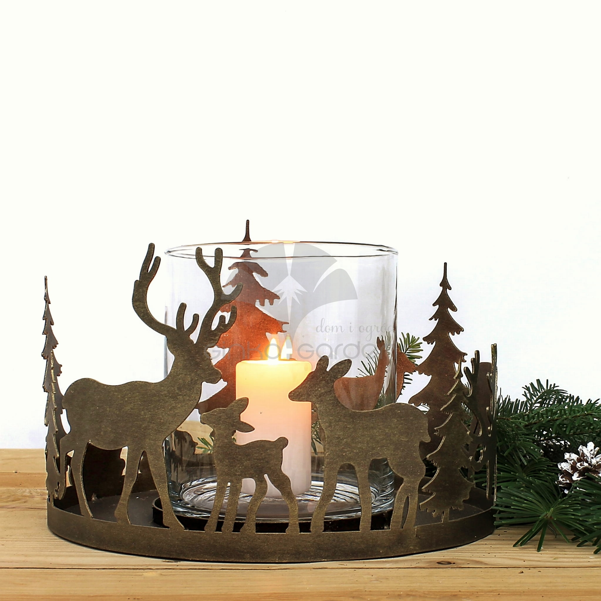 Metalowy świecznik bożonarodzeniowy z motywem jelonków z wkładem szklanym. Dekoracja świąteczna wykonana w Polsce z wysokiej jakości stali, pomalowana na kolor złotej rdzy.
