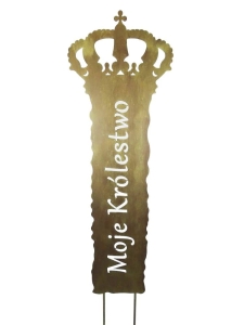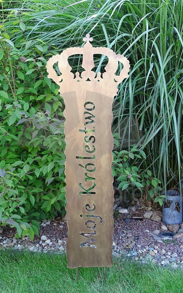Metalowy szyld ogrodowy z napisem "Moje królestwo" w kolorze złotej rdzy
