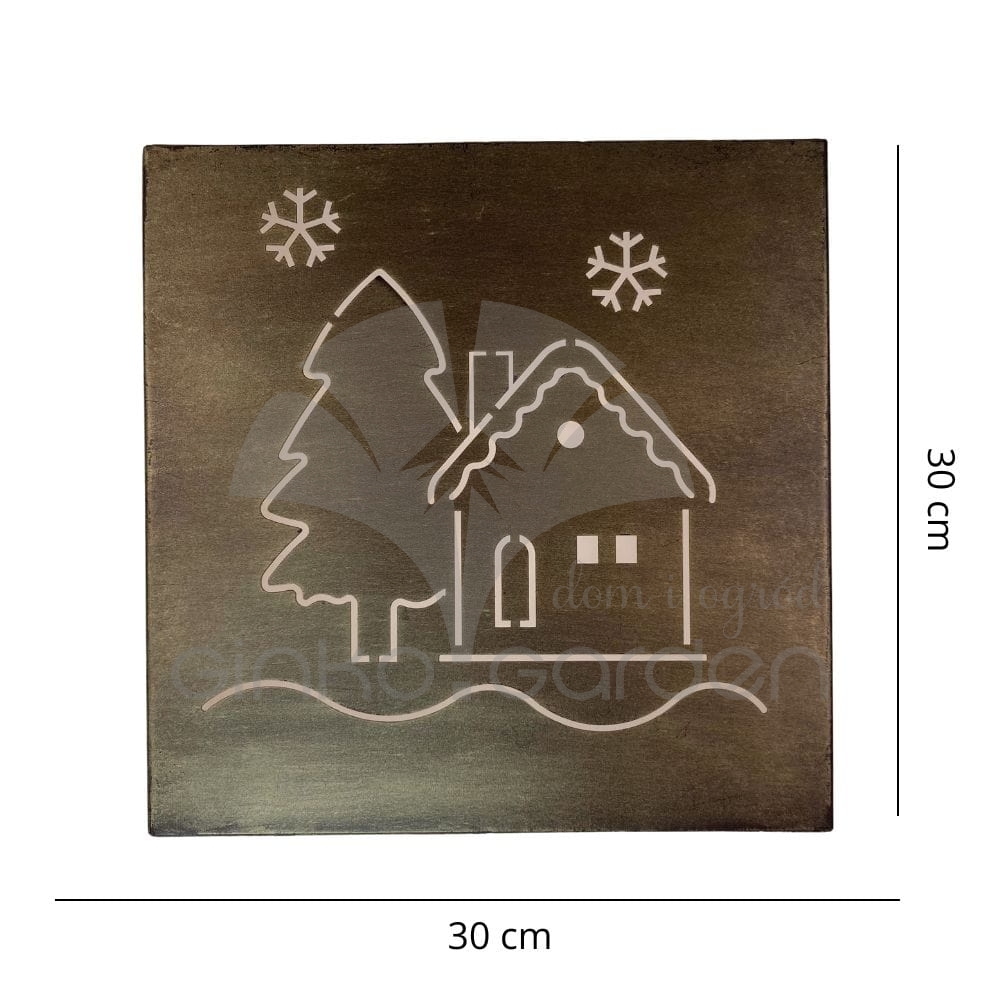Metalowy obraz z motywem zimowego domku - wyjątkowa dekoracja świąteczna na ścianę. Wykonana w Polsce z wysokiej jakości stali, pomalowanej proszkowo na kolor złotej rdzy. Ozdoba odporna na warunki atmosferyczne.