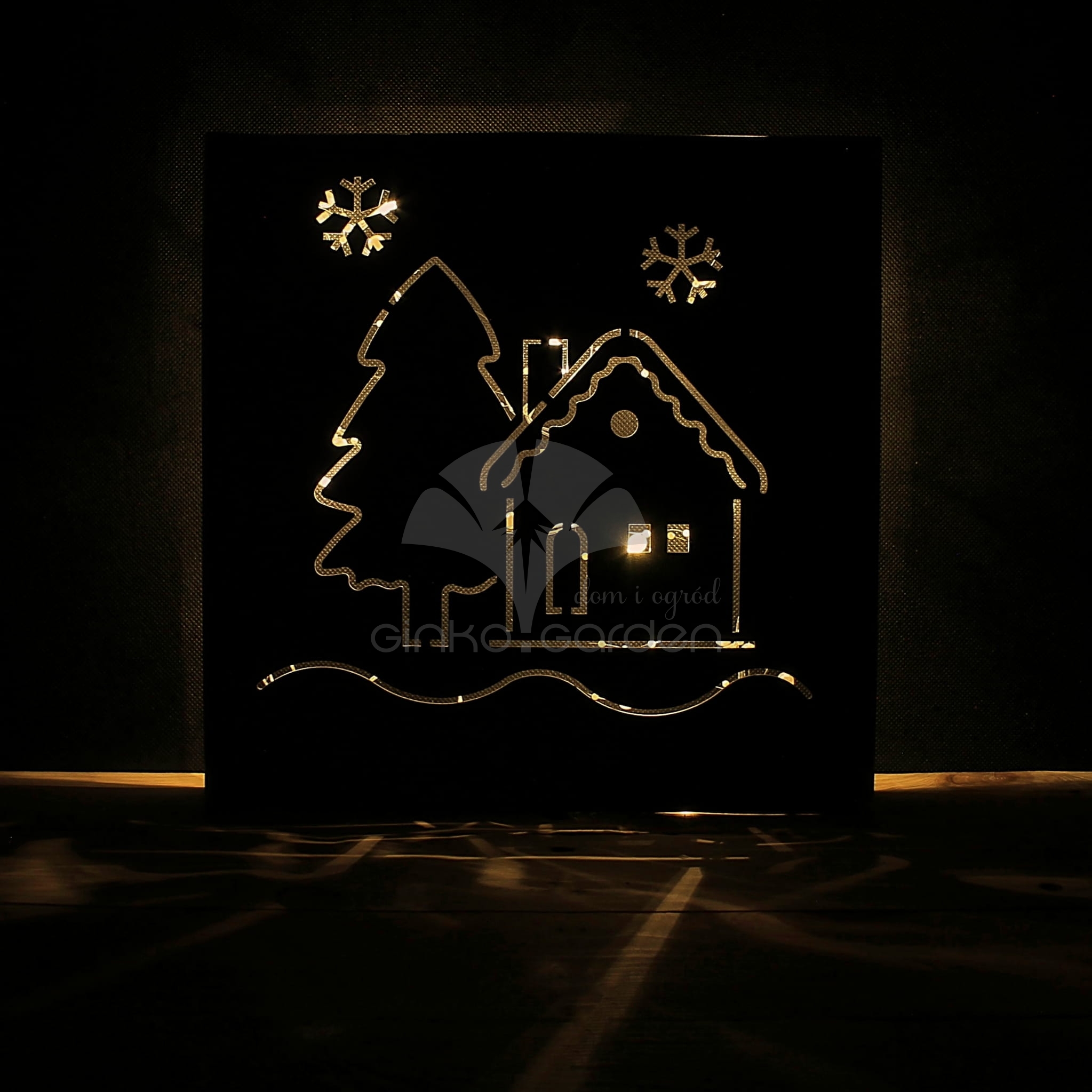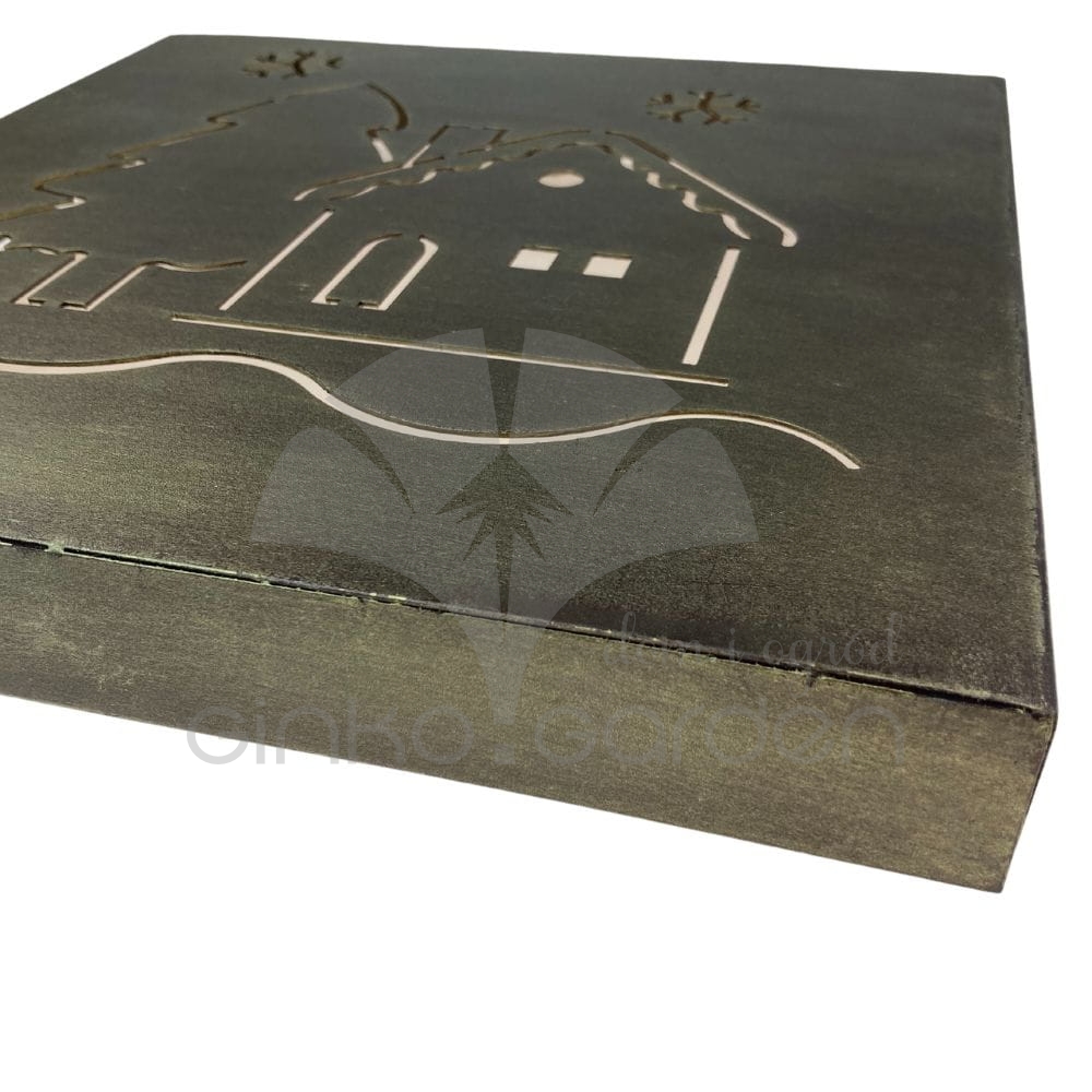Metalowa świąteczna ozdoba ścienna - tabliczka Domek z choinką do podświetlenia w kolorze złotej rdzy