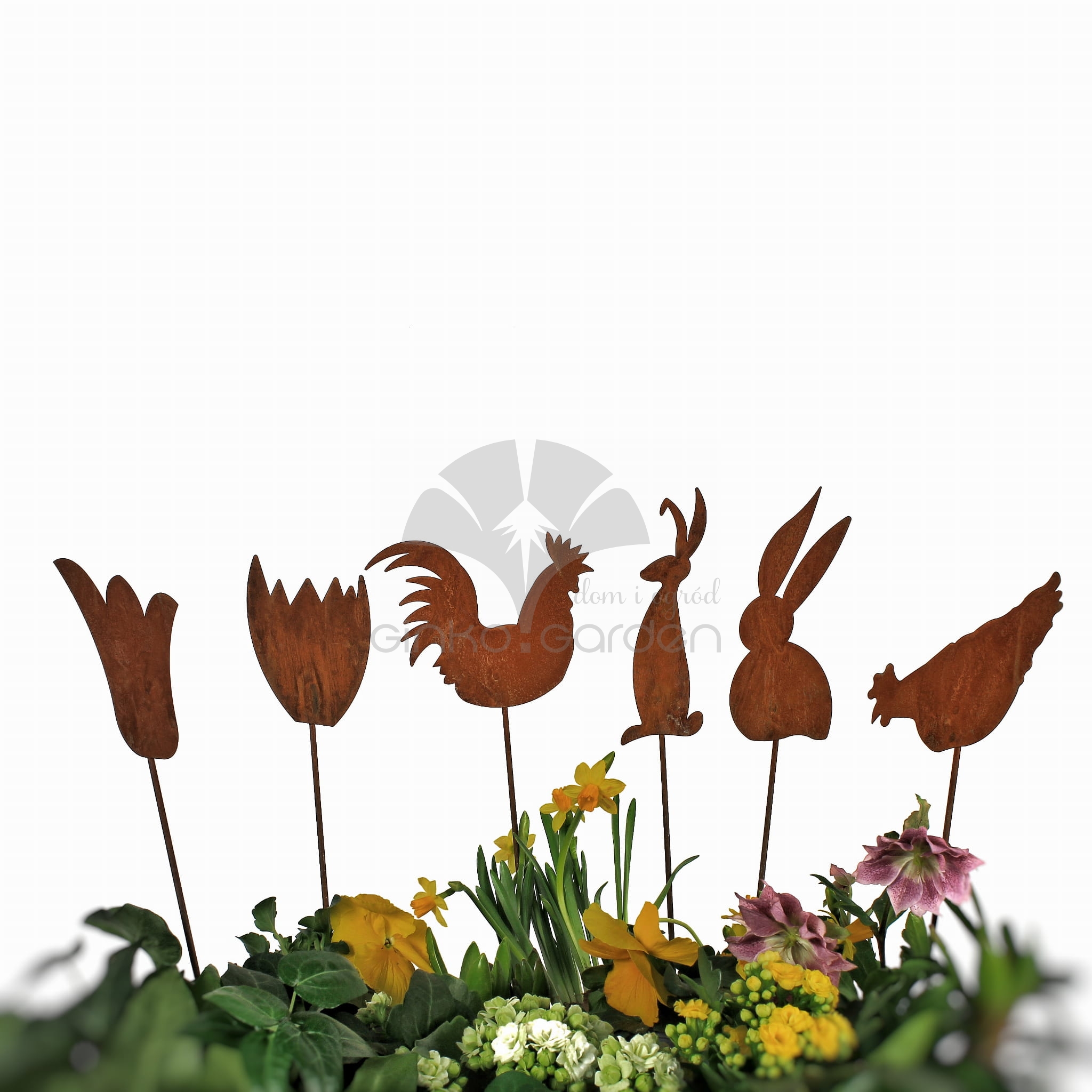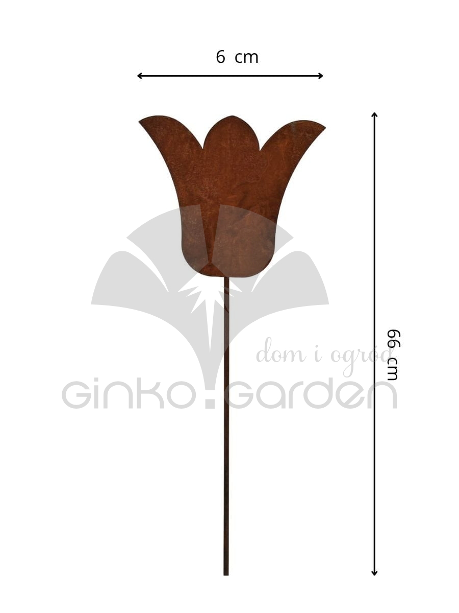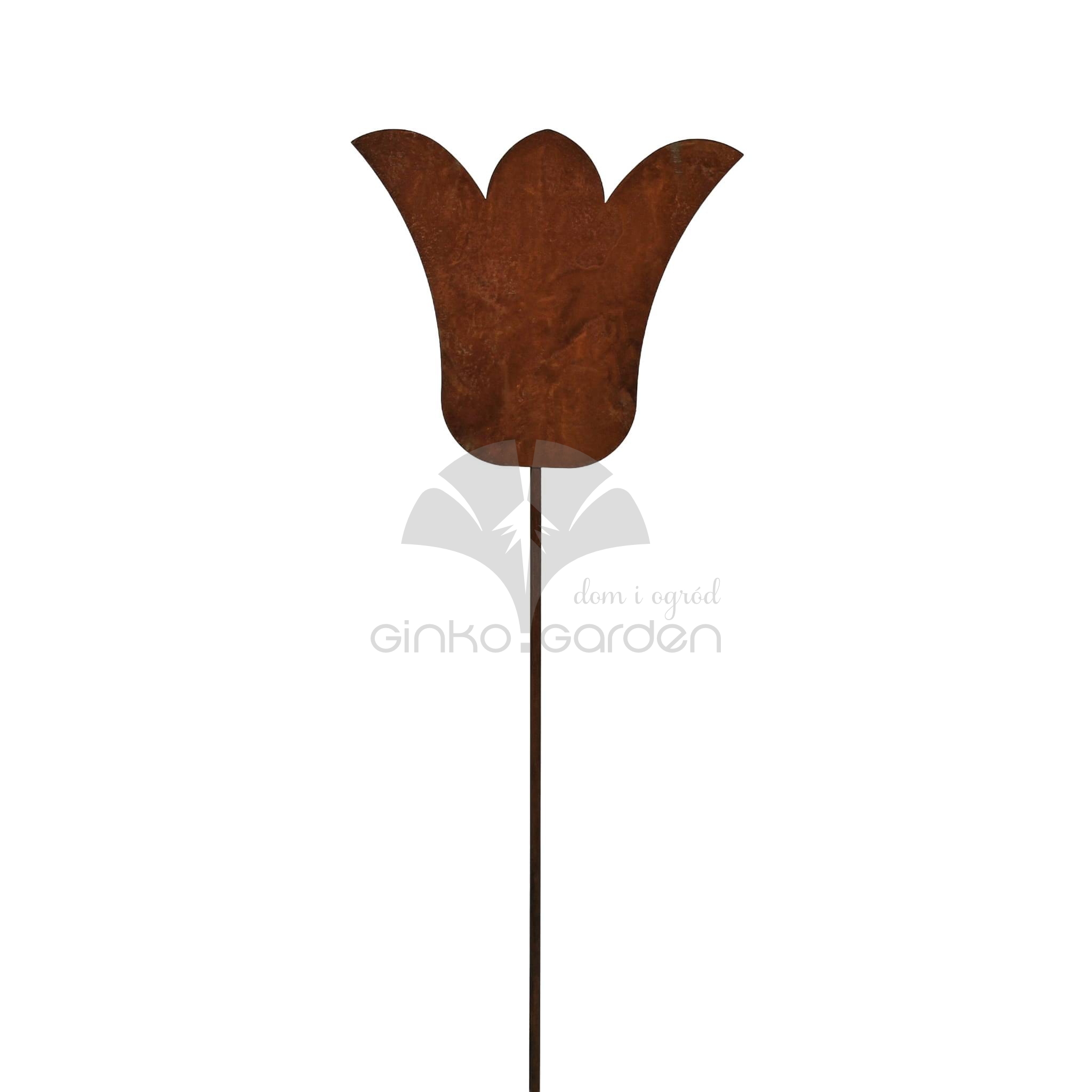Dekoracja na Wielkanoc w kształcie tulipana na pręcie. Ozdoba wykonana w Polsce z wysokiej jakości stali, pokrytej naturalną warstwą rdzy. Odporna na warunki atmosferyczne.