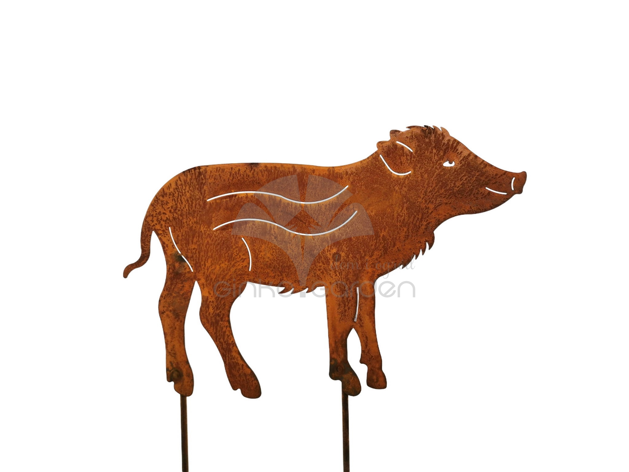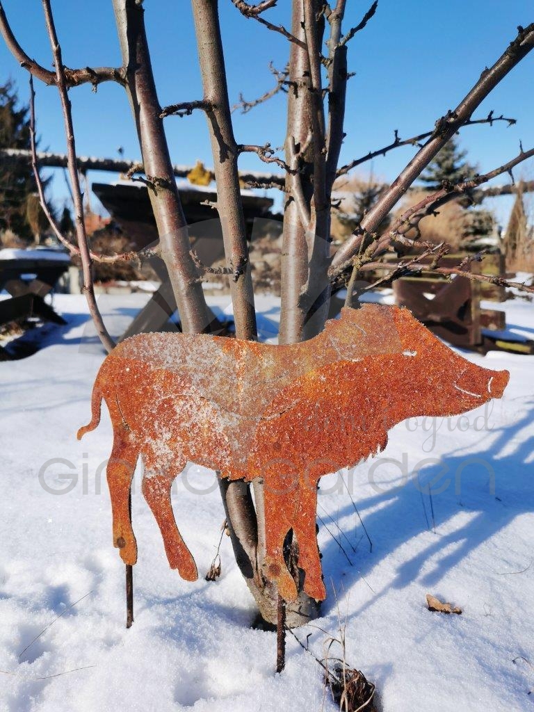 Warchlak – mały dzik do wbicia na prętach, czyli ozdobna figurka ogrodowa w kolorze naturalnej rdzy.
