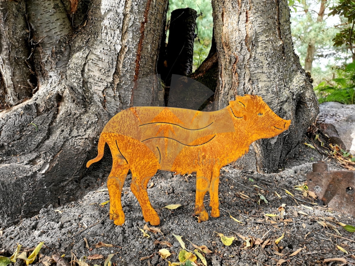 Metalowa figurka ogrodowa w kształcie małego dzika Warchlaka, pokryta naturalną rdzą. Idealna dekoracja ogrodowa z metalu.